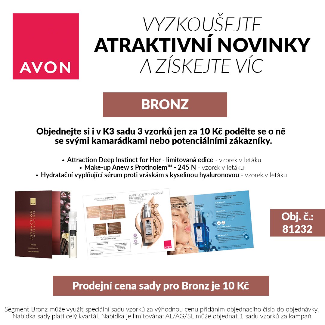 tento mini katalog vychází každý měsíc, stejně jako katalog. Je určený pro vás Avon Lady a pro registrované zákazníky. Najdete v něm motivace, zvýhodněné sady a novinky se slevou až 70 %. Navíc zde najdete objednací čísla vzorků. POZOR, počet sad nebo výrobků může být limitován - toto najdete na spodní stránce, nebo u ceny výrobku. Ceny jsou tzv. NETTO, nevztahují se na ně již slevy, ale počítají se vám do výše objednávky, pro výpočet slevy. Jeden tištěný Focus magazín na následující kampaň (měsíc) budete mít vždy zdarma v balíčku.