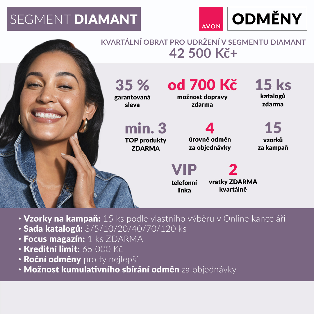 Chcete se těšit ze slevy 35 % na všechny produkty z katalogu i v kampaních 7, 8 a 9 roku 2026? Nominujte se do konce K6 tj. do 30.6.2026 opět do segmentu DIAMANT. Pokud součet Vašich objednávek dosáhne za kampaně 4, 5 a 6 celkem výše 42.499 Kč, můžete se v kampaních 7, 8 a 9 roku 2026 těšit na slevu 35%, doručení ZDARMA, Focus magazín zdarma, 3 výrobky - novinky na kampaň zdarma, 15 katalogů zdarma, 15 ks vzorků zdarma, 50% sleva na výrobky z Logo programu a Speciální listiny novinek.