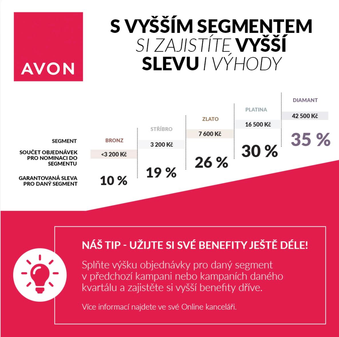 V Avon online kanceláři si můžete prohlédnout, v jakém segmentu jste a jaké máte výhody. Možná Vám do vyšší úrovně chybí jen kousek. Pokud byste chtěla vědět víc, klidně nám napište. Rádi Vám poradíme.