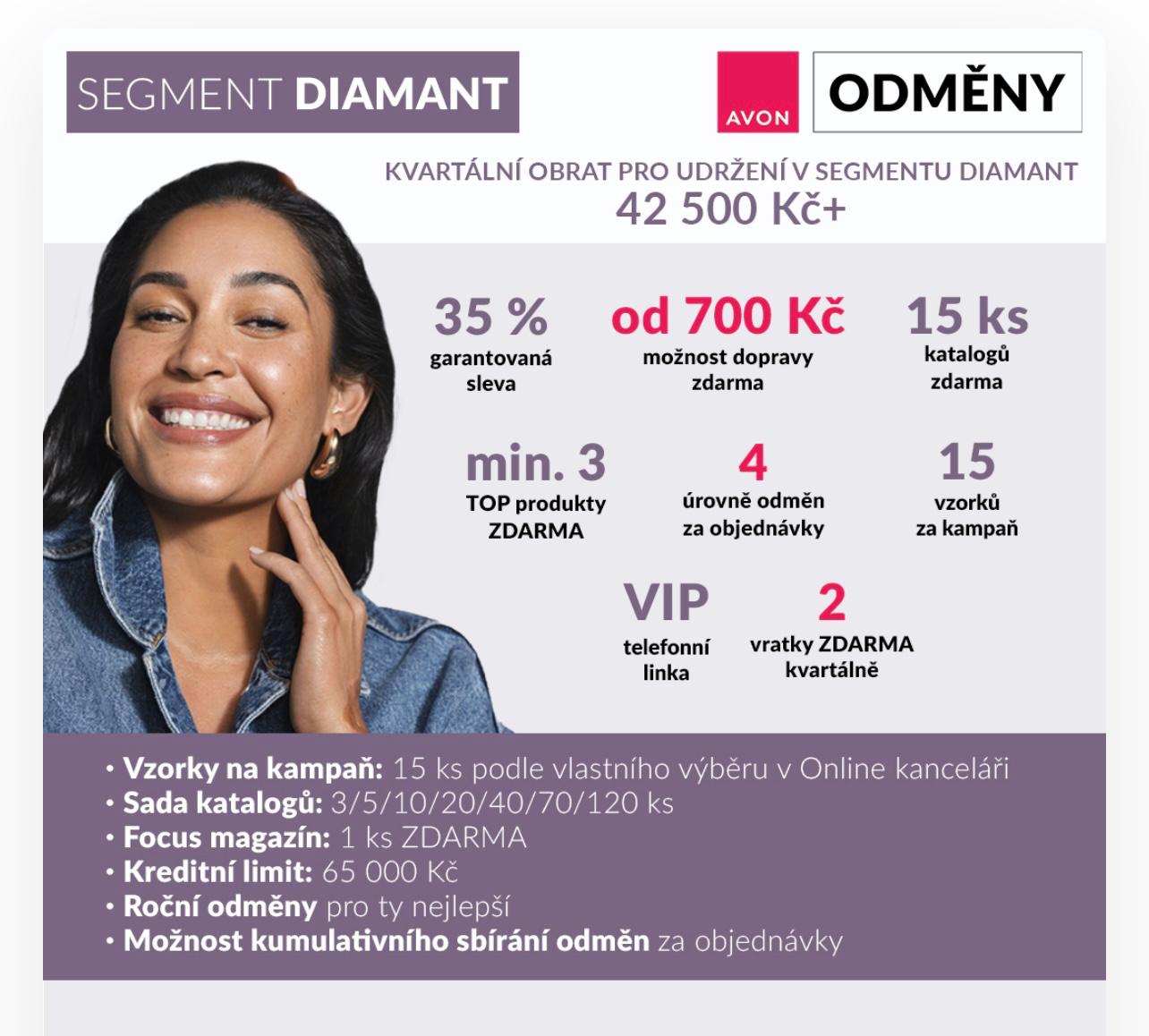 Chcete se těšit ze slevy 35 % na všechny produkty z katalogu i v kampaních 4, 5 a 6 roku 2026? Nominujte se do konce K3 tj. do 31.13.2026 do segmentu DIAMANT. Pokud součet Vašich objednávek dosáhne za kampaně 1, 2 a 3 celkem výše 42.499 Kč, můžete se v kampaních 4, 5 a 6 roku 2026 těšit na slevu 35%, doručení ZDARMA, Focus magazín zdarma, 4 výrobky - novinky na kampaň zdarma, 16 katalogů zdarma, 15 ks vzorků zdarma, 50% sleva na výrobky z Logo programu a Speciální listiny novinek.