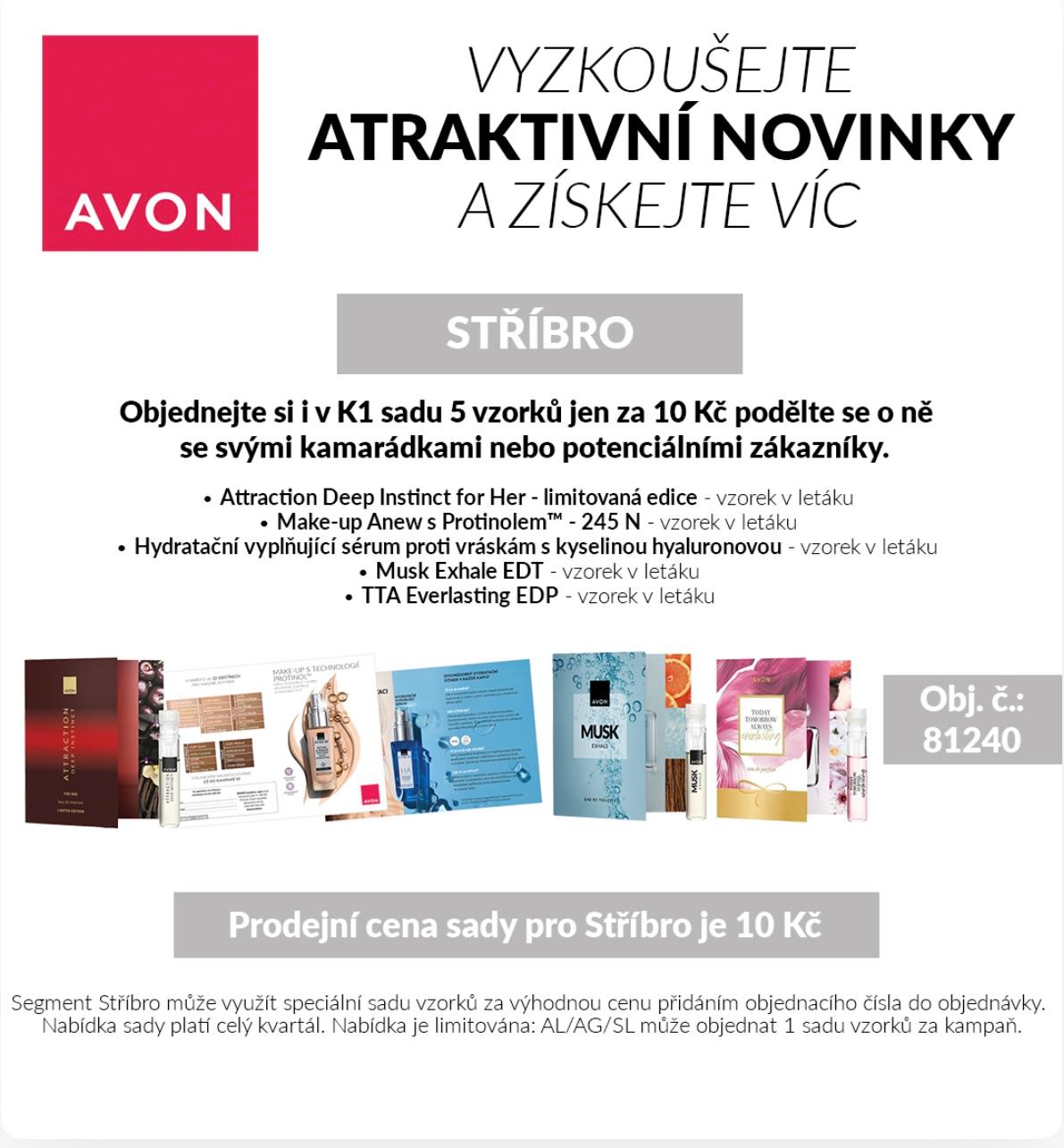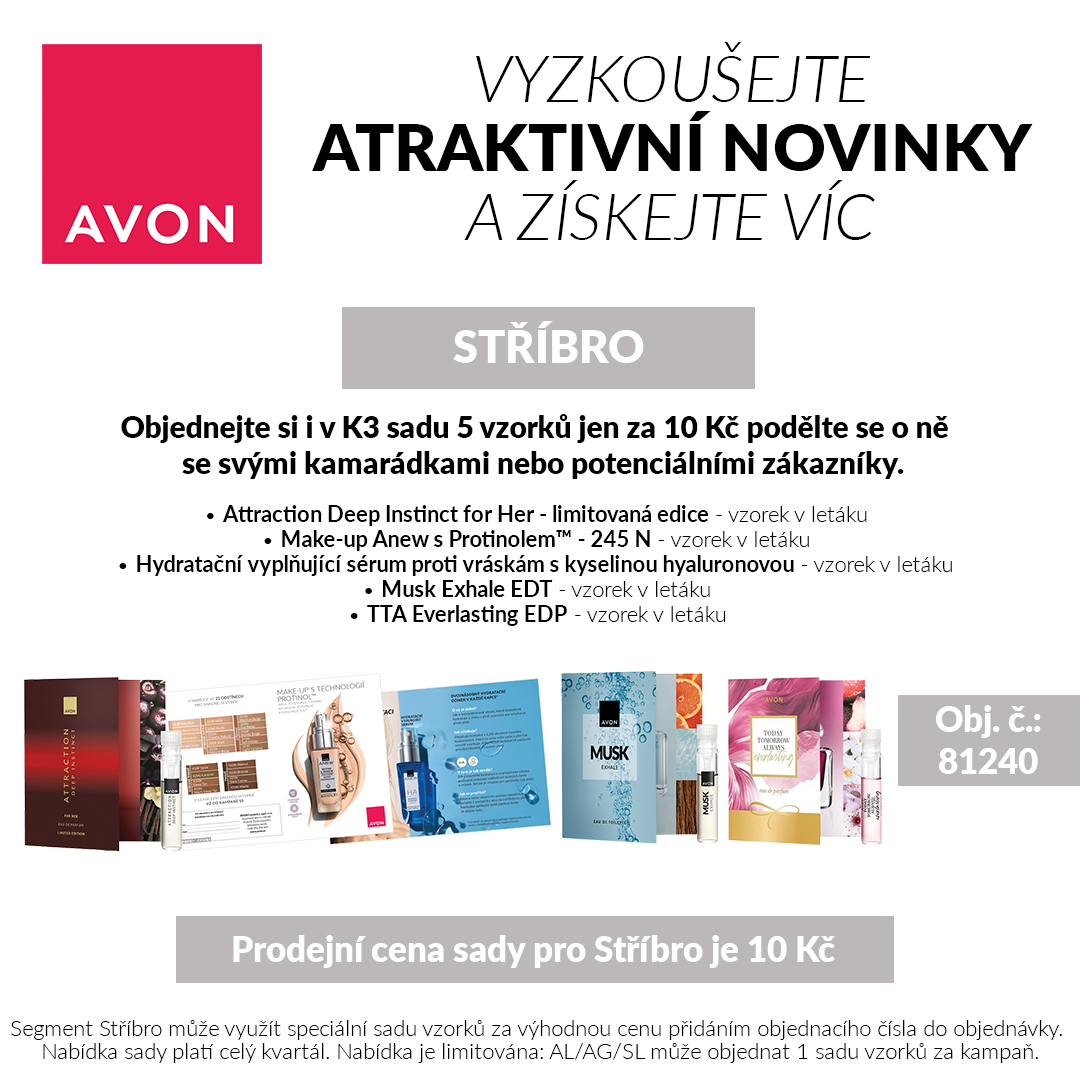 tento mini katalog vychází každý měsíc, stejně jako katalog. Je určený pro vás Avon Lady a pro registrované zákazníky. Najdete v něm motivace, zvýhodněné sady a novinky se slevou až 70 %. Navíc zde najdete objednací čísla vzorků. POZOR, počet sad nebo výrobků může být limitován - toto najdete na spodní stránce, nebo u ceny výrobku. Ceny jsou tzv. NETTO, nevztahují se na ně již slevy, ale počítají se vám do výše objednávky, pro výpočet slevy. Jeden tištěný Focus magazín na následující kampaň (měsíc) budete mít vždy zdarma v balíčku.